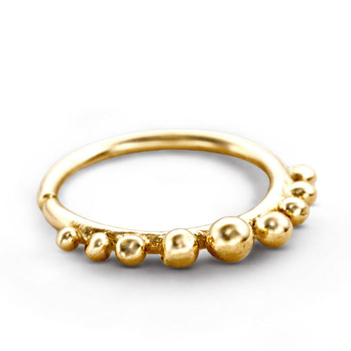 כדורי המתכת לאורך החישוק עדינים ומחזירים אור זוהר שמאיר את הפנים.