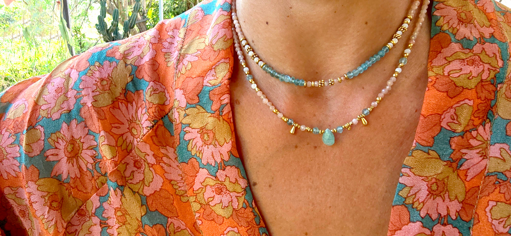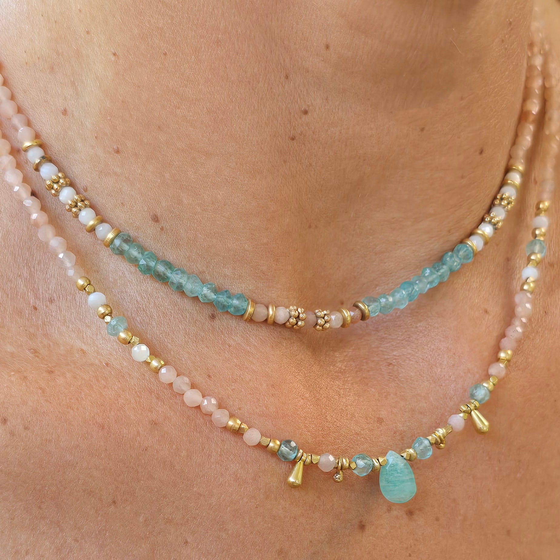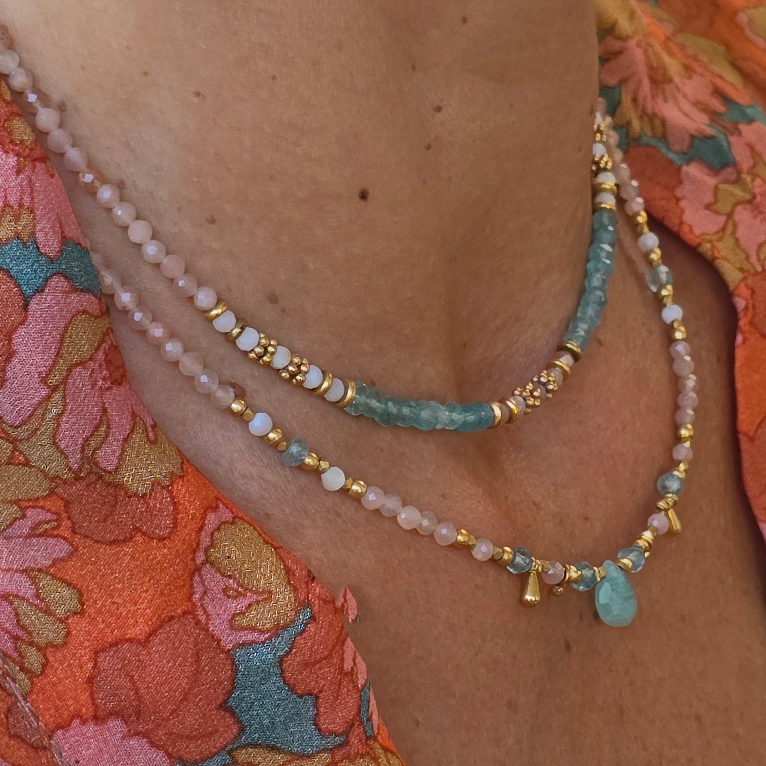 שני השרשראות יחד יוצרות הרמוניה מושלמת של רוך ועוצמה, עם אבני חן בגווני תכלת, זהב וורוד אפרסק עדין, שמזכירים מים זורמים ואור.