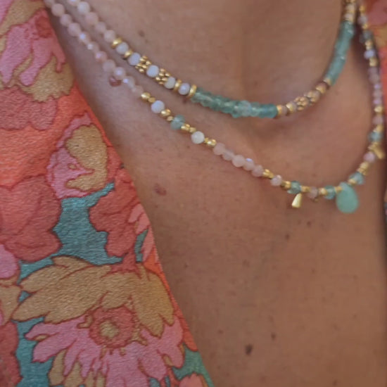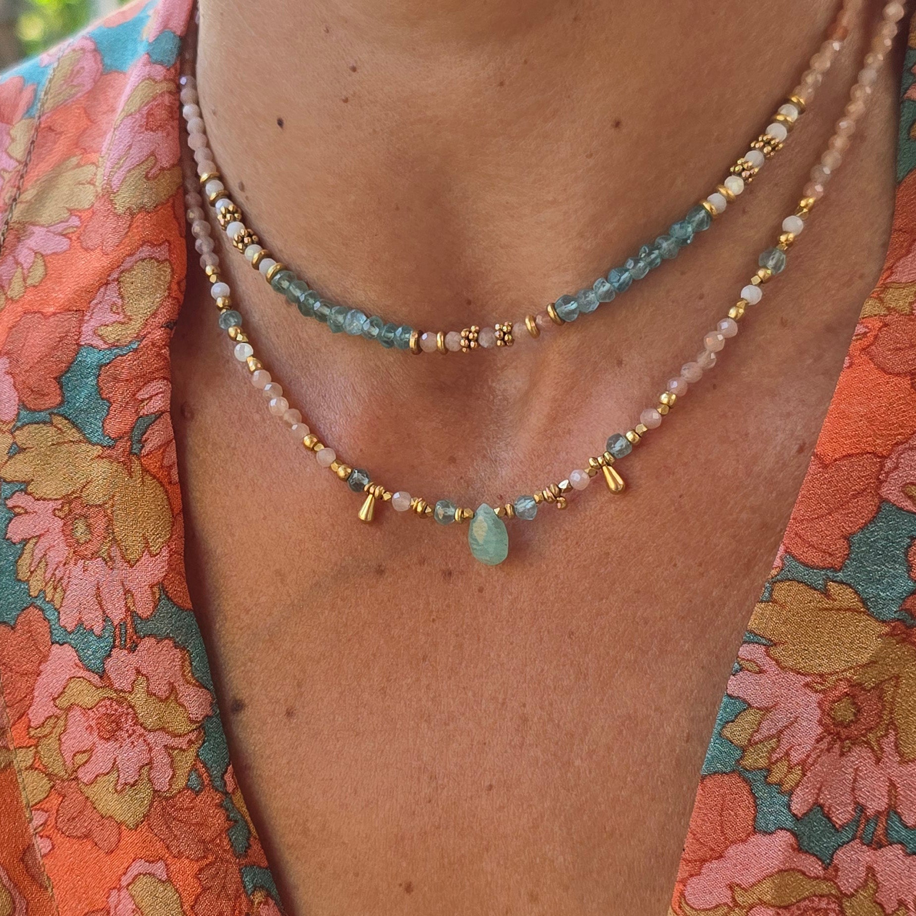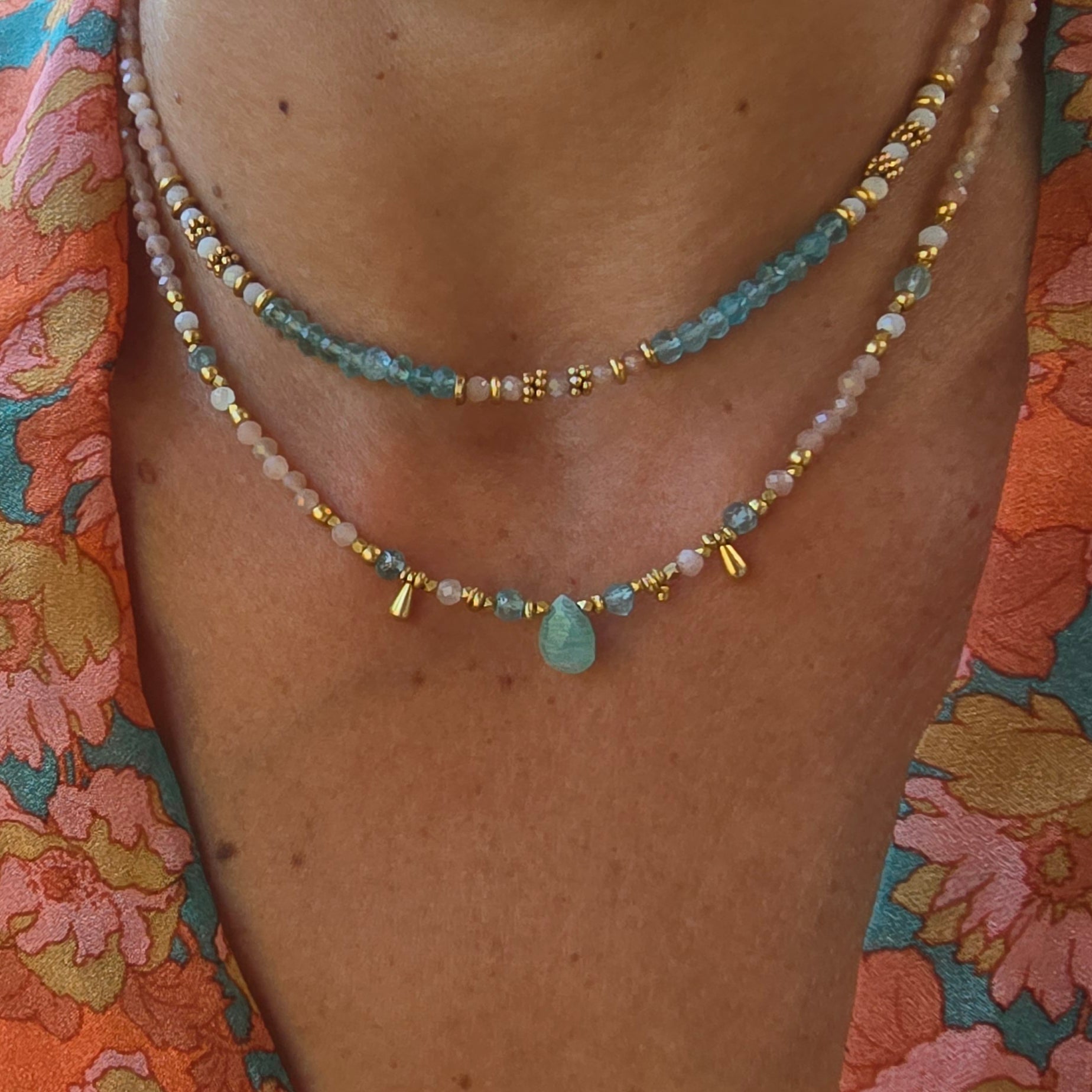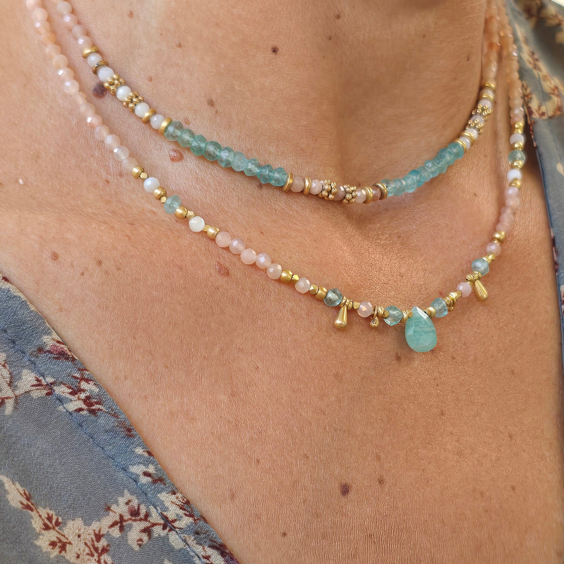 שני השרשראות יחד יוצרות הרמוניה מושלמת של רוך ועוצמה, עם אבני חן בגווני תכלת, זהב וורוד אפרסק עדין, שמזכירים מים זורמים ואור.