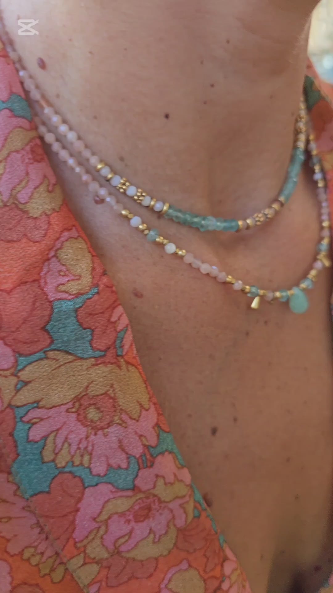 השרשרת העליונה קצרה וצמודה, יוצרת תחושת עיגון וביטחון; התחתונה מעט ארוכה יותר, נושאת את האבן המרכזית – טיפה של אנרגיה רכה – כמו נשימה קטנה של ים.