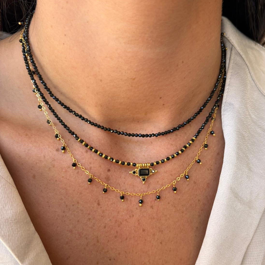 השרשרת הפשוטה - חרוזי ספינל שחור שנבחרו אחת אחת, משהו שמדבר על הכוח השקט שבפשטות. יש בה משהו מהאלגנטיות הטבעית - יופי פשוט ונקי.