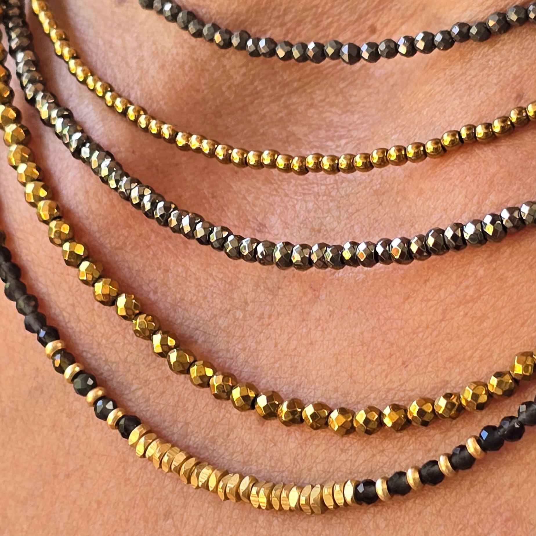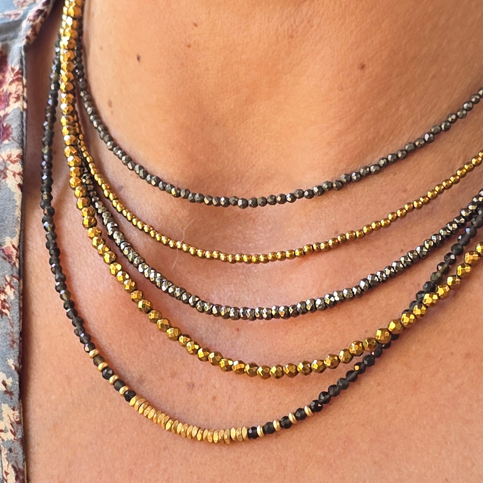 סט רב-שכבתי ועדין מקריסטלים טבעיים – המטייט אפור-כסוף, פיריט מוזהבת, ספינל שחור וחרוזי בראס היפואלרגניים.
