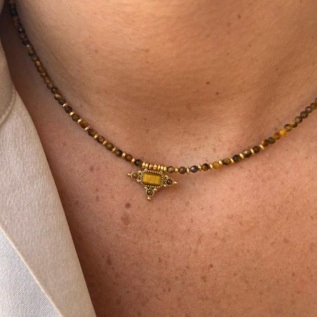 כשאת עונדת את השרשרת הזו במצבים מאתגרים, משהו קורה: את מוצאת את המילים הנכונות, הגרון נרגע והלב מתמקד. עין הנמר מעודדת חשיבה צלולה ומסייעת לראות את הדברים מנקודת מבט רחבה יותר.