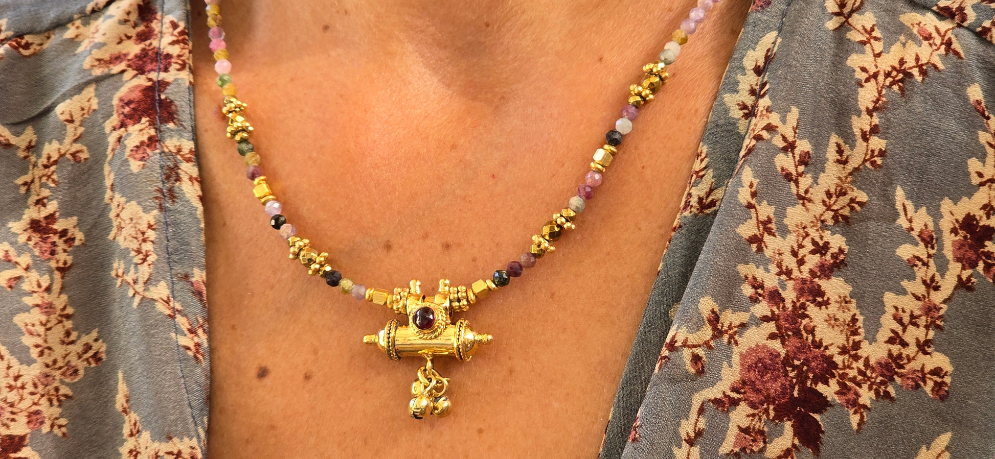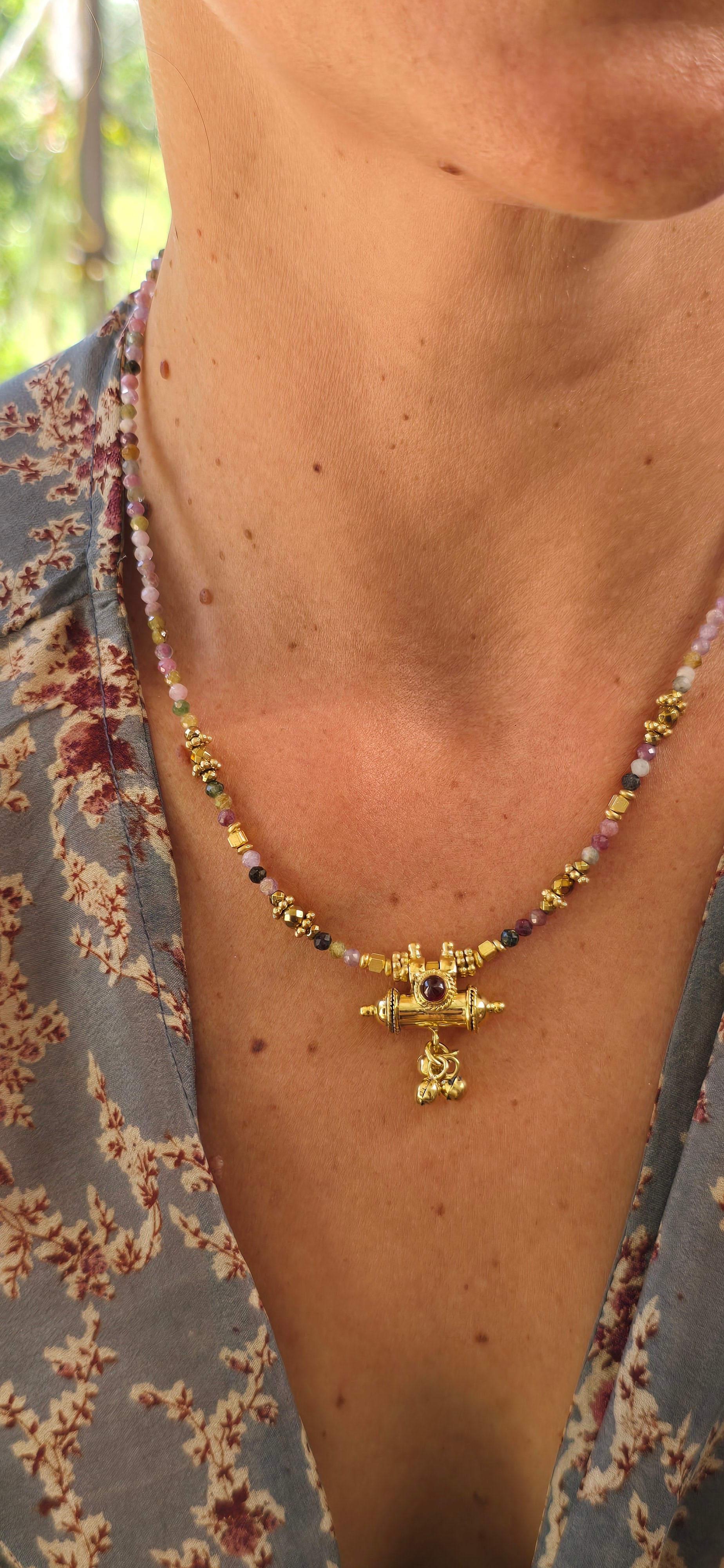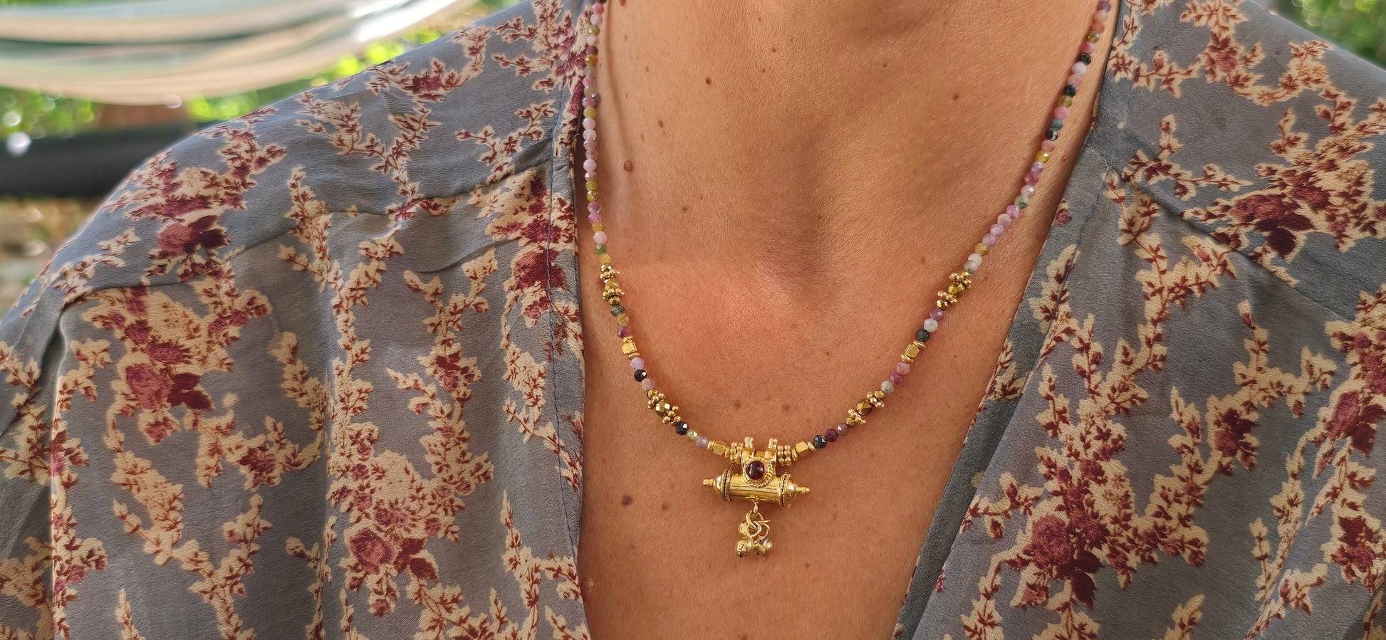 התליון מעוצב כקופסה קטנה ונפתחת, עם נוכחות בוהו-אלגנטית שמשלבת חרוזי טורמלין אבטיח בגוונים טבעיים ועדינים לצד אלמנטים זהובים ותליון מרכזי מעוטר בפרטים עשירים. במרכזו משובצת אבן טורקיז קטנה שמוסיפה טאץ' של צבע והגנה אנרגטית.